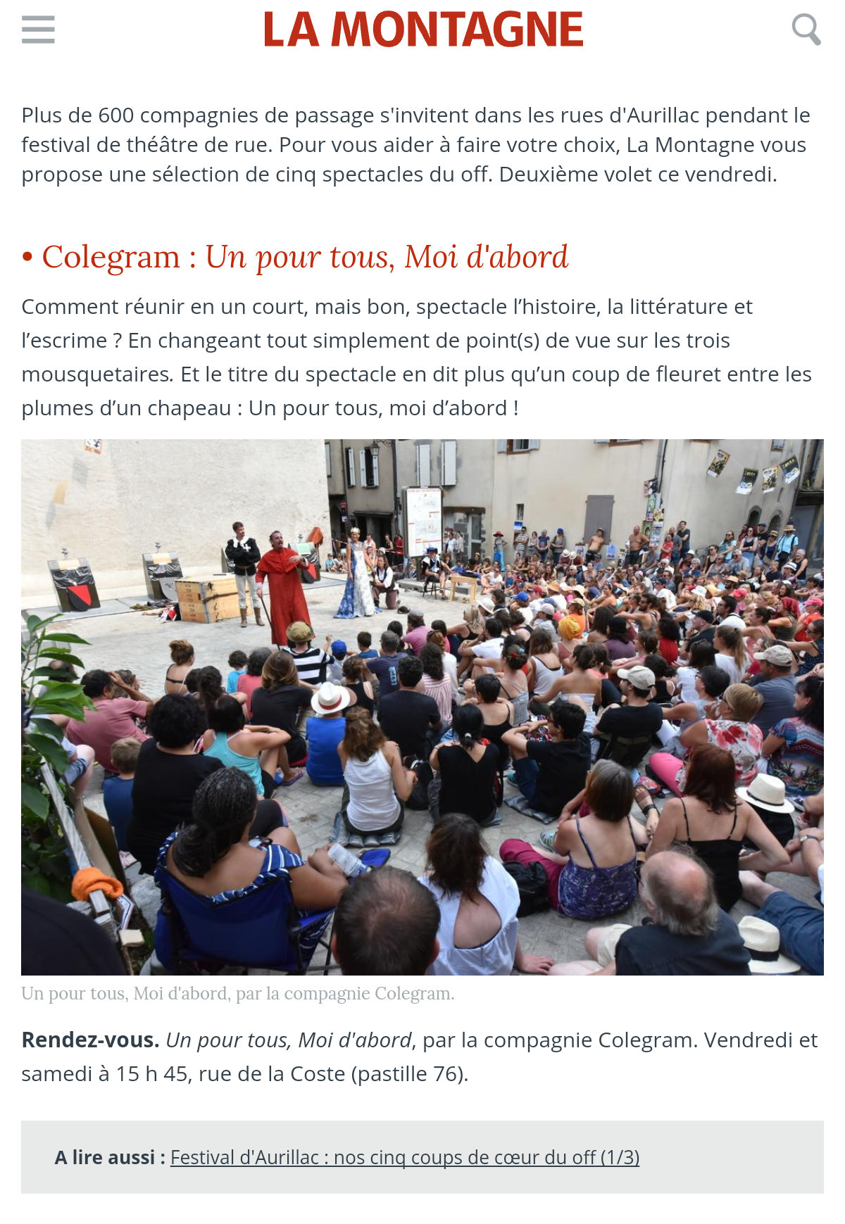 Après deux représentations, le journal La Montagne annonça que notre Un pour tous, Moi d’abord ! était un de ses 5 coups de cœurs (sur 600 spectacles)
